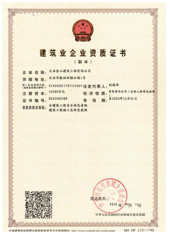 大冶金山建筑工程有限公司始建于1984年,屬鎮辦集體企業。1997年改制為大冶山建筑工程有限責任公司,屬股份制企業。2013年更名為大冶金山建筑工程有限公司,2018年3月公司資源重組,公司注冊資金達到10180.00萬元,公司法定代表人為劉瑞華。公司具有古建筑工程專業承包壹級、建筑工程施工總承包貳級、市政工程總承包叁級、鋼結構工程專業承包叁級資質。